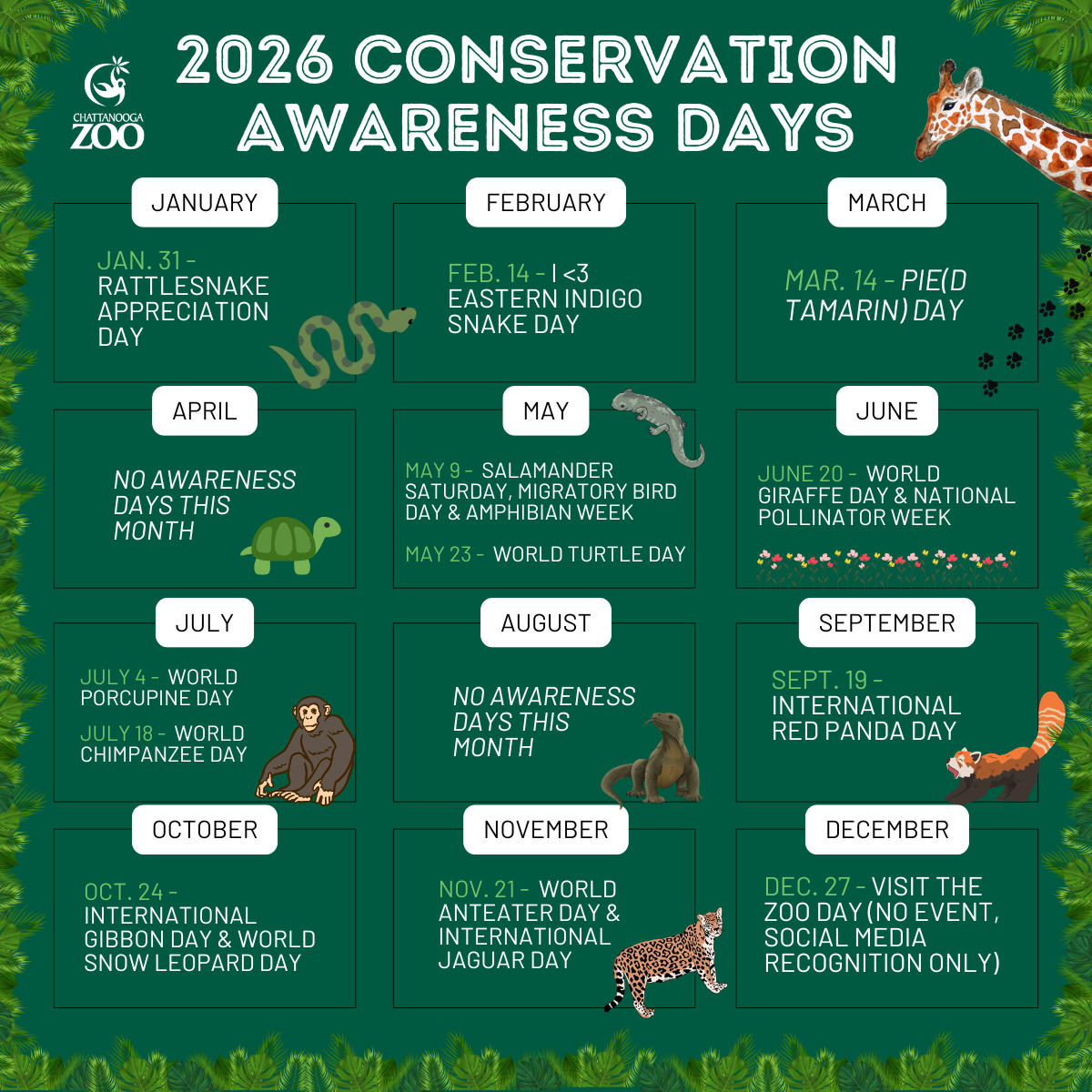 Celebrate conservation holidays with us throughout 2026 to help spread awareness!