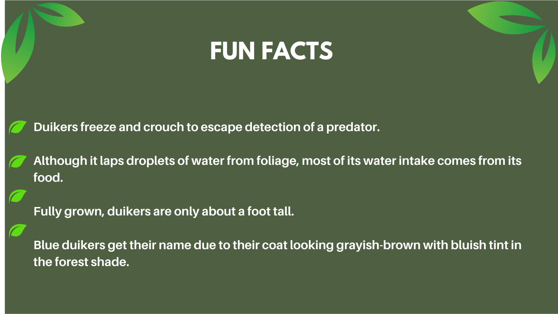 Blue duikers get their name from their coloration, as their coats appear almost blue in the shady habitats they are found in.