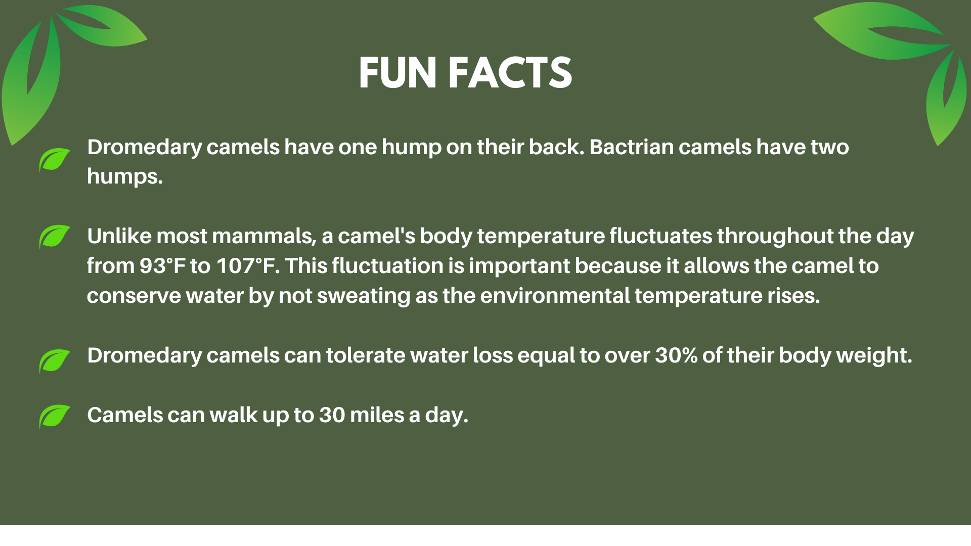 The camel's hump is its most notable feature. However, contrary to popular belief, a camel's hump is not filled with water or used to store water. Instead, it is filled with fat (up to 80 lbs) that is metabolized for energy and water when needed. As the fat is used up the hump will become flabby and flop onto its side. By storing most of its fat in one place, a camel is not covered in insulating fat and thus can stay cooler in the desert heat.