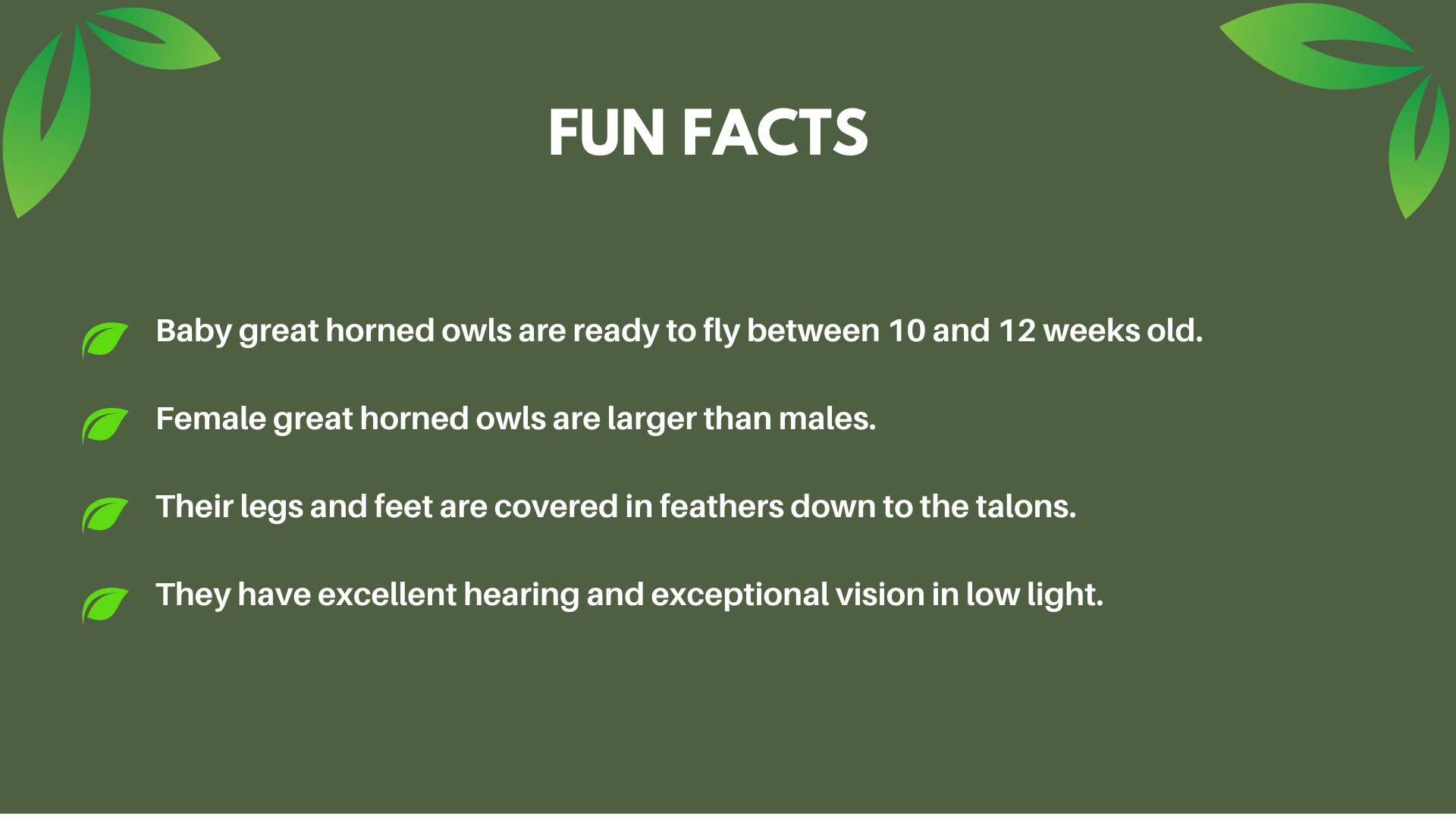 The great horned owl is named for the protrusions on both sides of their head that look like ears. These ear tufts are not actually ears, but simply tufts of feathers called plumicorns. Scientists don’t know why these owls have these tufts of feathers but they do have a few theories. The tufts might help members of their own species to recognize each other among the forest around them, or they may use the tufts to blend into their surroundings, making them look more like broken tree branches helping to camouflage them.