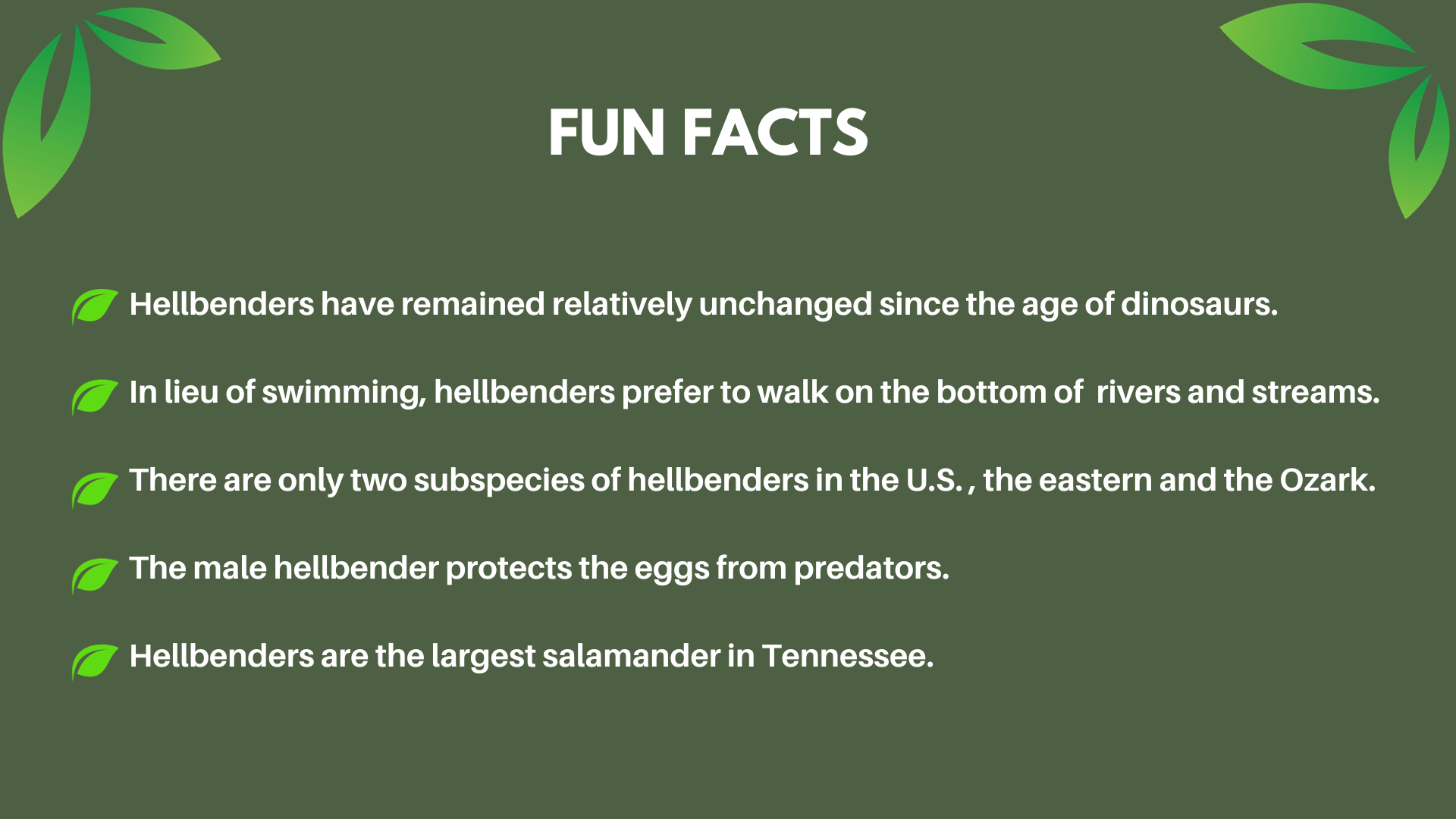 The Eastern hellbender is Tennessee's largest salamander at 11 1/2 to 20 inches long and weighing up to 5 pounds. They have several nicknames such as mud devil, devil dog, ground puppy, and snot otter. The later is because their body is covered in mucus that protects them from parasites and is distasteful to predators. They inhabit clean, fast-flowing streams and rivers with lots of large, flat rocks for cover protection. Hellbenders rarely leave the water. They have lungs, but breathe entirely through the thousands of capillaries found in the wrinkly folds of their skin. Because they breath through their skin, hellbenders are extremely sensitive to climate change and pollution and are known as an "indicator species." Warm water holds less oxygen than cold water, thus making them more at risk to climate change as their home heats up and there is less oxygen in the water.