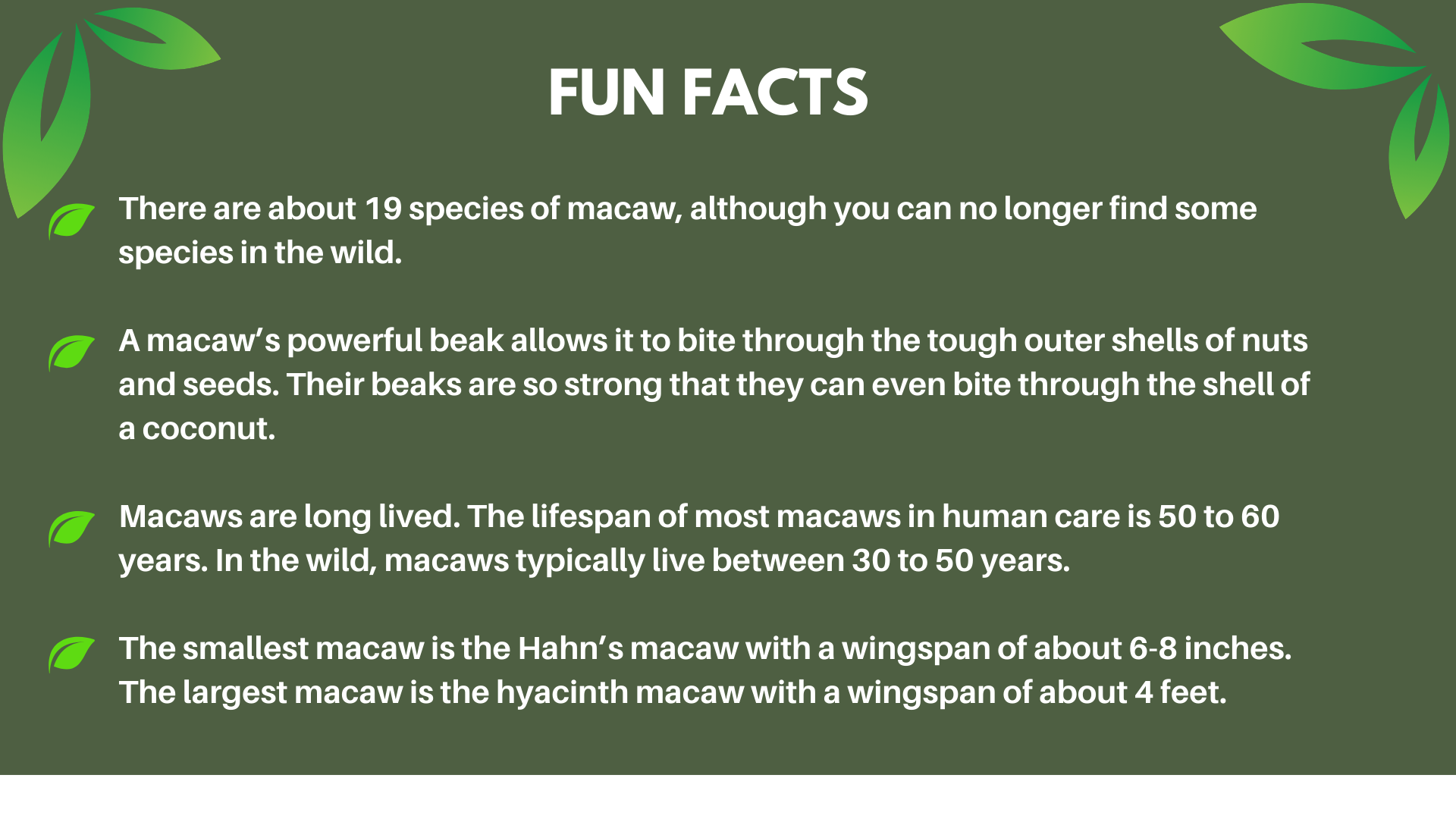 You can see three different macaw species at the Chattanooga Zoo--a green wing macaw, a blue and yellow macaw, and a scarlet macaw. Macaws are typically large, brightly colored parrots with long tail feathers. The characteristic that distinguishes macaws from other members of the parrot family is their bare facial areas that vary in size and pattern according to different species. Macaws range in size from the smallest Hahn's macaw (12 inches) to the largest of all parrots, the hyacinth macaw (40 inches).