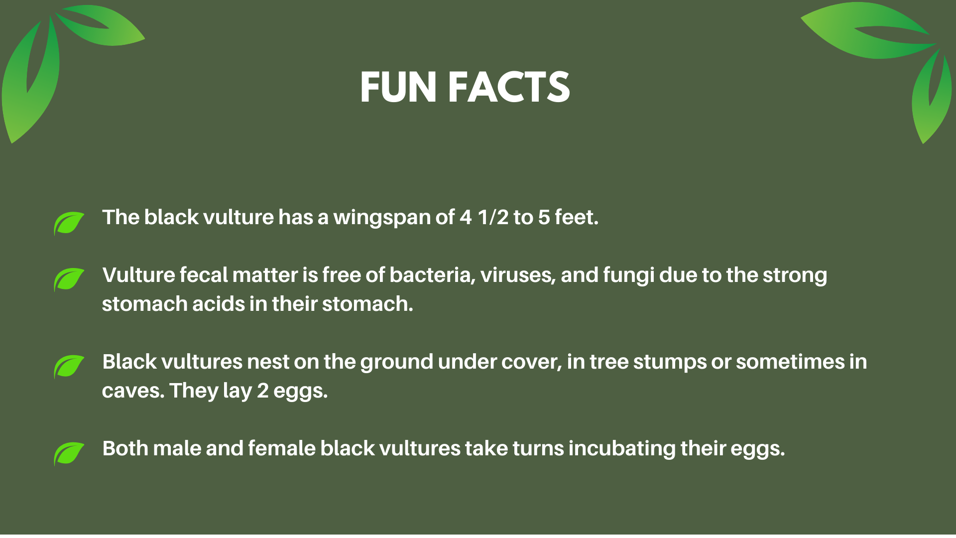Black vultures feed on carrion. They are often seen feeding in large groups but will eat almost anything. As scavengers, these birds play a vital role in the environment by removing decaying carcasses that could otherwise cause the spread of disease.