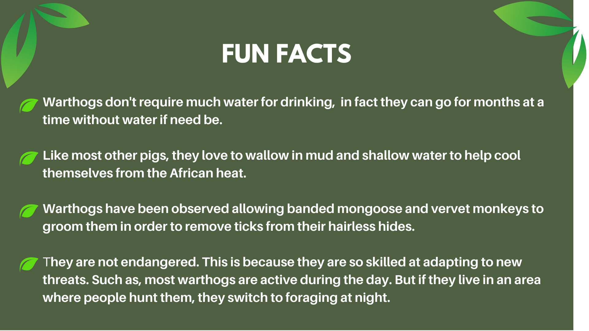 Large cats, crocodiles, and wild dogs are usually their main predators. If they aren't able to outrun their enemies, their tusks are the second line of defense. Warthog use their tusks for digging, fighting with rivals and defending themselves against predators.